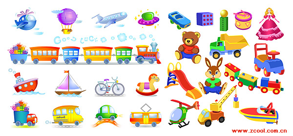 eps format, including jpg preview, keyword: vector toys, Children, cute, aircraft, hot air balloon, a flying saucer, toy car, toy train, horse, yacht, truck, bicycle, slides, doll, buses, vector material
